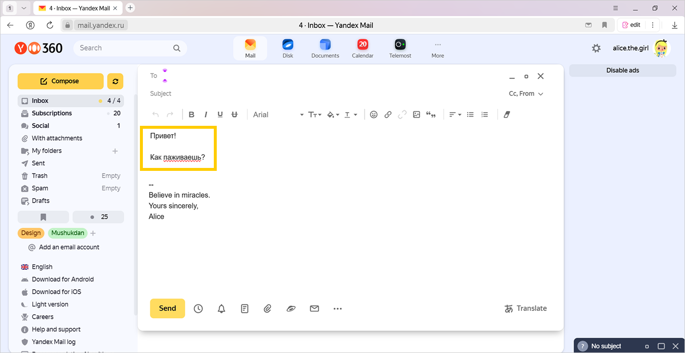 When you enter text, Yandex Browser underlines unfamiliar words. If you are sure the underlined word is spelled correctly, right-click it and select Add to dictionary.