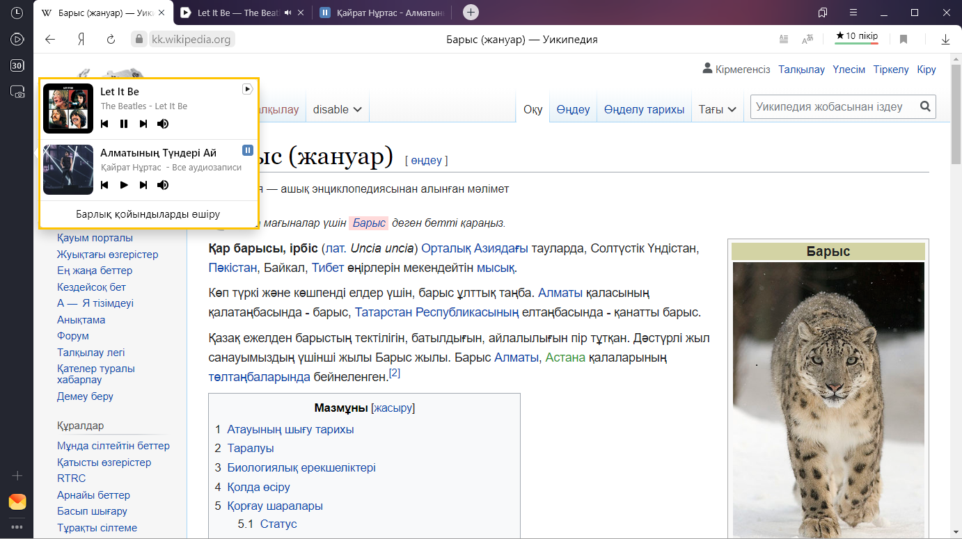 Браузерде бір мезгілде сайтты қарауға және басқа қойындыда қосылған музыканы тыңдауға болады. Қойындылар арасында ауысу үшін белгішесіне бүйірлік тақтада басыңыз. Пайда болған басқару панелінде тректі паузаға қоюға немесе қайтадан қосуға, плейлистегі алдыңғы немесе келесі трекке ауысуға болады.