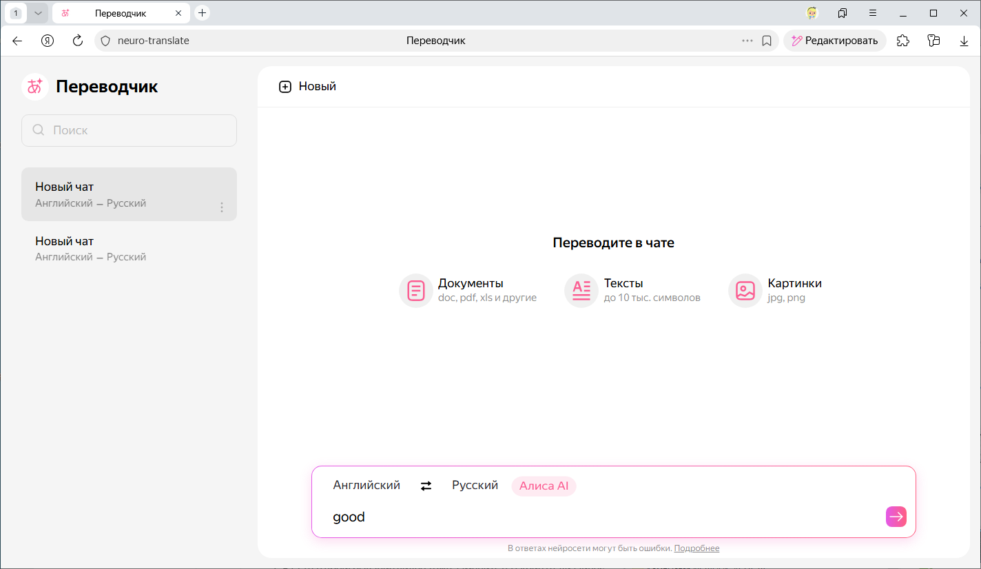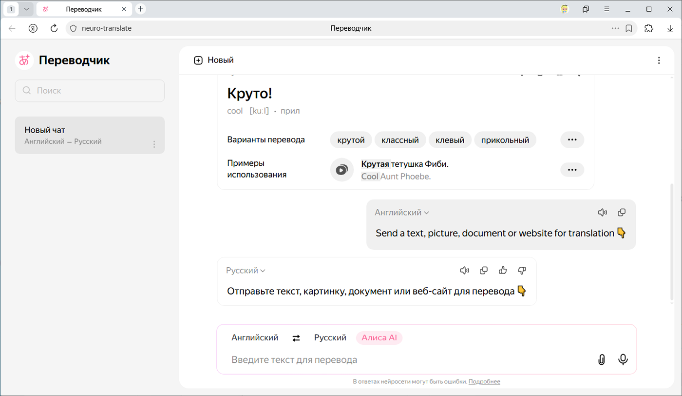 Он работает в формате чата: вы отправляете запрос на перевод текста, картинки, сайта или документа, а в ответ получаете готовый перевод.