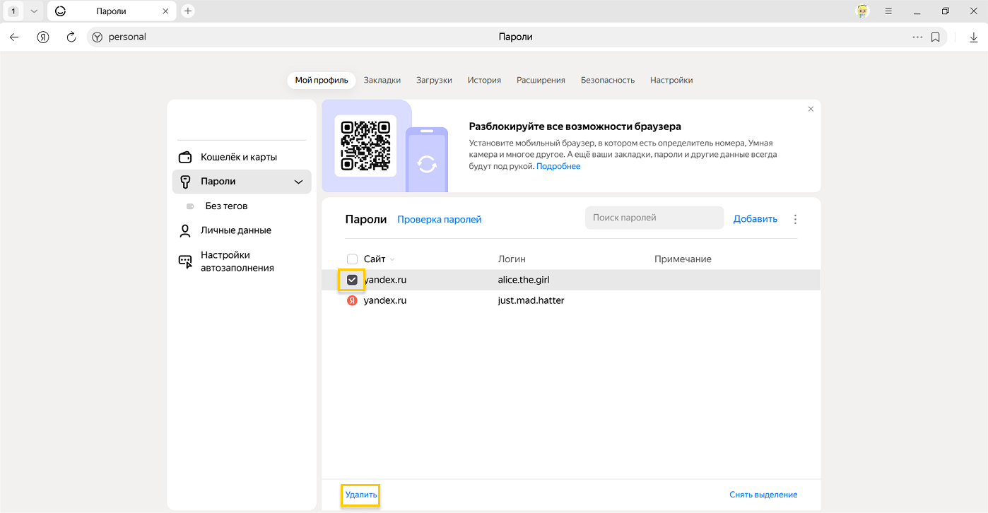 Если вы удалили пароль по ошибке, то сразу можете его вернуть. В левом нижнем углу менеджера паролей нажмите Восстановить. Если вы перезагрузите страницу или перейдете на другую вкладку, то не сможете вернуть пароль.
