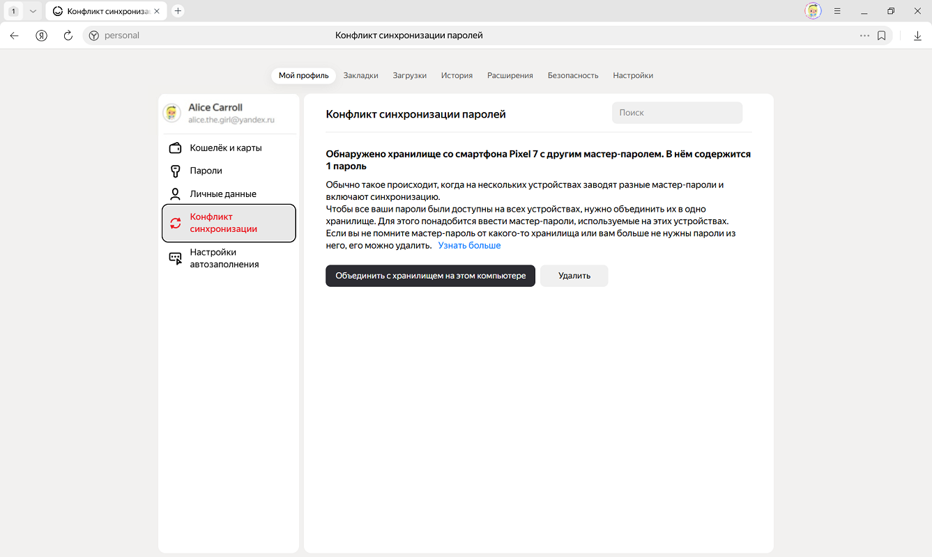 Если вы меняете мастер-пароль или создаете разные мастер-пароли на устройстве с отключенной опцией передачи паролей, возникнет конфликт. Например, вы ввели один мастер-пароль на смартфоне, который передает пароли, а другой — на компьютере, на котором эта опция отключена. Затем вы включили на компьютере передачу паролей. В этом случае Браузер не может понять, какой из мастер-паролей нужно использовать для шифрования объединенного хранилища.
