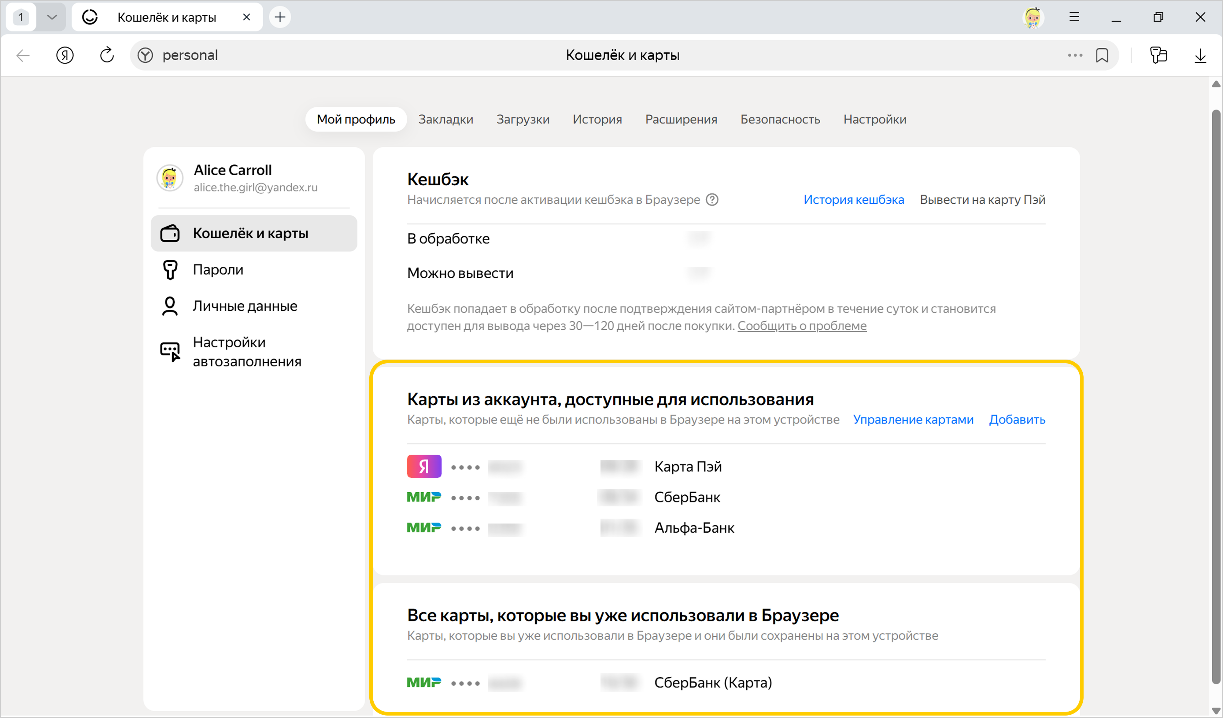 Информация о ваших сохраненных картах доступна в разделе настроек Кошелёк и карты.