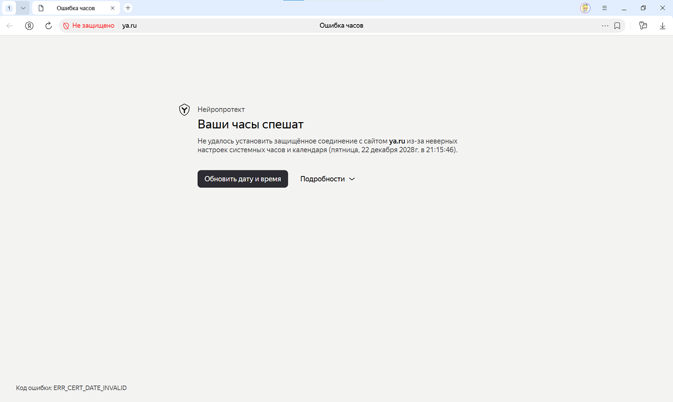 Если на вашем компьютере неверно установлено время, Браузер не сможет определить, актуальный сертификат у сайта или нет. Поэтому при открытии сайта вы увидите сообщение «Ваши часы спешат» или «Ваши часы отстают».