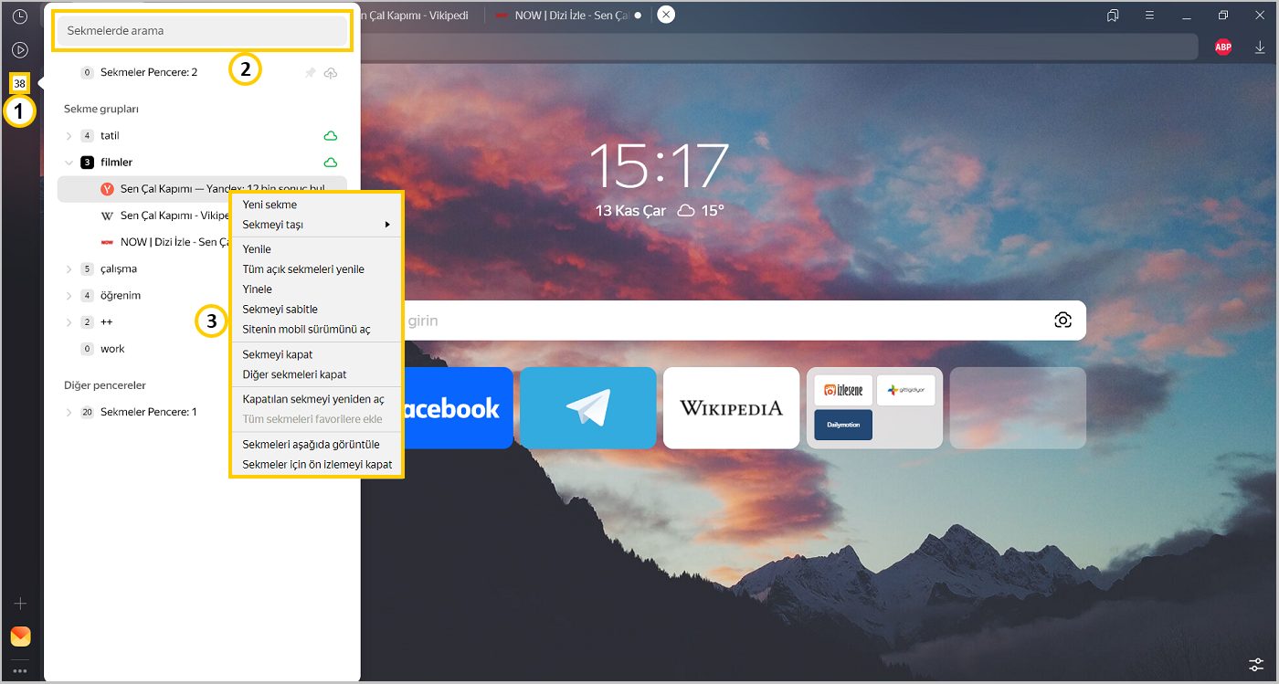 Çok sayıda sekme açık olduğunda bu sekmelere geçiş yapmak zorlaşır. Yandex Browser sekmelerin dikey liste olarak görüntülendiği ve gruplara göre gruplandığı özel bir panelde çok sayıda sekme ile çalışmanıza olanak sağlar.