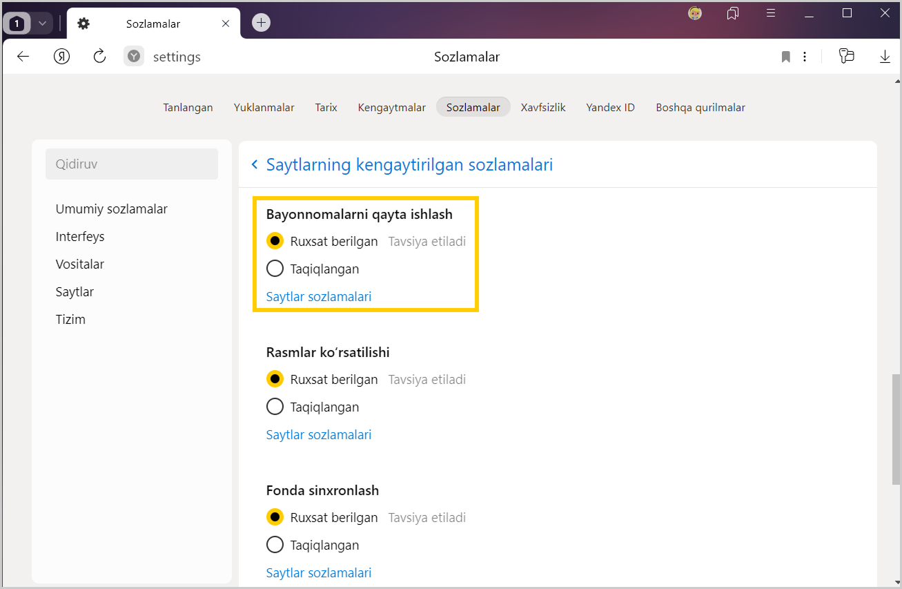 Yandex Brauzer sozlamalarida elektron pochta va taqvim uchun sukut bo‘yicha ishlatiladigan veb-xizmatni berish mumkin.