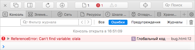 Консоль қойындысына өтіп, Қателер сүзгісін қосыңыз. Тар терезеде сүзгі атауы жасырылуы мүмкін: терезені кеңейтіңіз.