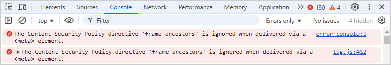 Перейдите на вкладку Консоль и включите фильтр Ошибки. В узком окне название фильтра может быть скрыто: разверните окно.