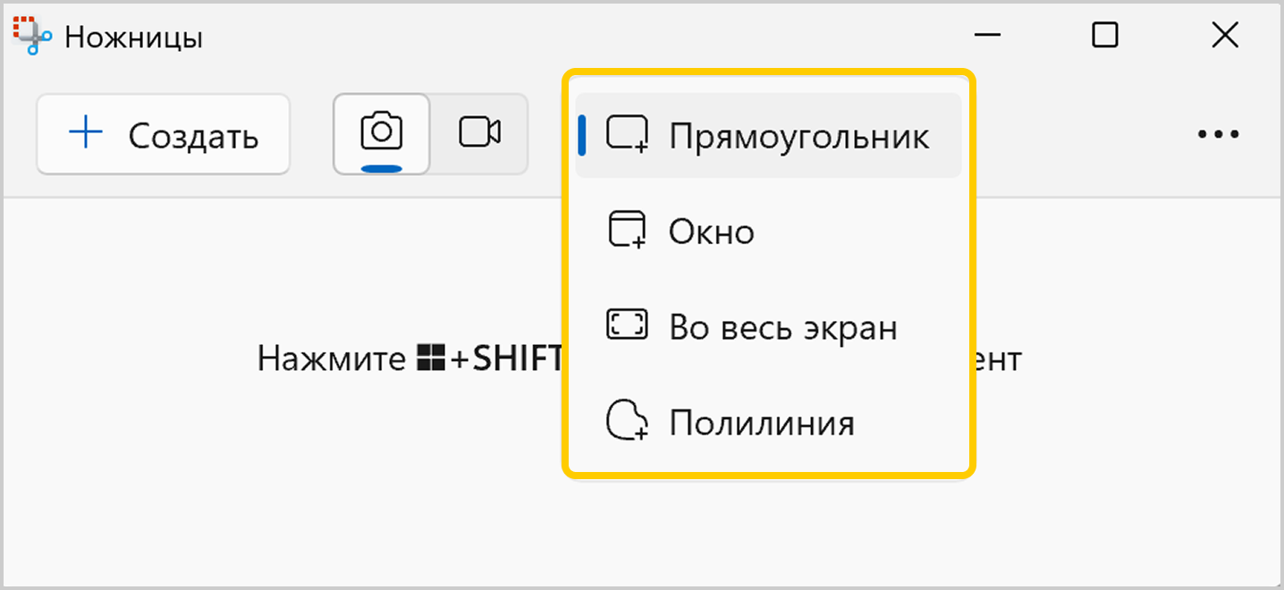 Нажмите кнопку Создать и выберите область: прямоугольную или произвольную форму, сделайте снимок отдельного окна или всего экрана.