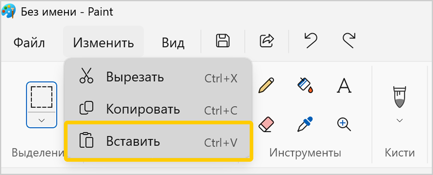Нажмите сочетание клавиш Ctrl + V или в верхнем меню программы нажмите Изменить → Вставить (для Windows 7 и выше).