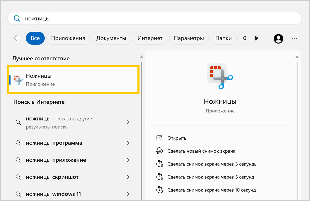 ножницыв поисковой строке и нажмите на название программы.
