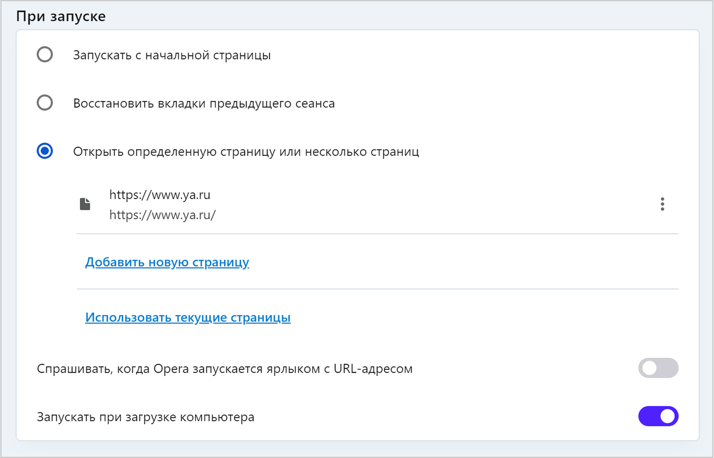 - В блоке При запуске выберите пункт Открыть определенную страницу или несколько страниц → Добавить новую страницу.