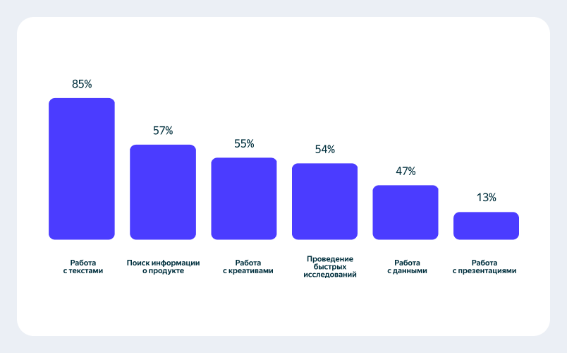 90% маркетологов, которые работают с Директом, уже активно используют AI-инструменты в своей работе. Для большинства (56%) это ежедневная практика, а ещё 34% специалистов обращаются к помощи искусственного интеллекта несколько раз в неделю.