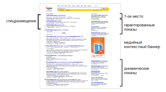 На страницах с результатами поиска Яндекса, поиска по Каталогу Яндекса и в рубриках Каталога показывается до трех объявлений в Спецразмещении. Спецразмещение – это выигрышное рекламное место с высокой кликабельностью, расположенное над результатами поиска или над основным содержанием страницы в Яндекс.Каталоге. В Спецразмещении объявления показываются гарантированно при каждом запросе, полностью совпадающем с указанной рекламодателем ключевой фразой (без стоп-слов).