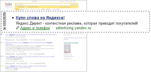 на страницах результатов поиска (http://www.yandex.ru/) Яндекса по выбранному вами запросу — до 12 объявлений,