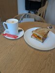 Чисто и симпатично, но кофе так себе и подача для такой цены какая-то грустная. Сендвич не впечатлил — хлеб недопрожаренный, просто мягкий и жирненький. С сыром в нём тоже не очень понятно, что пытались изобразить — он вяло расплавленный и холодный.