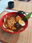 Ароматный куриный бульон, домашняя лапша, мясо говядины, кокосовое молоко, паста том-ям, японский омлет, грибы муэр, ростки маш.