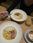 Ой, ну прям любовь🥹 Пошли по совету подруги, а в итоге потом повела еще и другую подругу😅 Действительно отличная карбонара, много соуса, также, я давно не пробовала такого вкуууусного цезаря, ну идеально-пармезанно💔 Волшебнейший коктейль порн-стар, который готова повторять снова и снова, ну и крем-брюле тоже был хорош! Во второй раз (23 октября) нас обслуживали невероятный официант и (по всей видимости) администратор, мальчики просто предоставили крутейший сервис и заботу, к сожалению, не запомнила имен! Рекомендую и однозначно хочу вернуться!!!