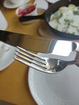 The place is really pretty. Interior is really well designed, the colours, the cutlery. Cutlery is another level. The steak knife looked really fancy, and I searched it on Google, to find out they gave me €12 knife. I felt fancy. These kind of details makes this café iconic. I could feel how this place is made with real love. You can see it in every detail We ordered, well, the longest dish on the menu. I don't remember the exact name, but it comes with meat served sous vide, very well cooked onions, potatoes, and sauce with heavy cream, parmesan, truffle oil. I couldn't feel truffle oil, according to how dish looked like, I think they used herb-infused oil, rather than truffle oil. Truffle has really strong flavour, you can't miss it in a dish. And this food comes with small salad: tomatoes, onion, some herbs. As we ordered meal, I thought it's gonna take some time, but surprisingly, they served it really quickly. The personal is really friendly, they welcome you and ready to help you. The service fee is 10% I don't know if I would go back, for 200k dish, I expected much complex flavours. It was simple but delicious
