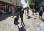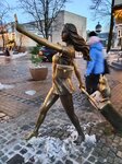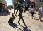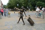 Жанровые скульптуры хоть и не претендуют называться произведениями искусства, но это всегда позитив. А фигурка «Курортницы» на Курортном проспекте в курортном Зеленоградске (такая вот тавтология), пожалуй, самое узнаваемое творение. Его еще именуют «Памятником туристке». Чтобы с ней сфотографироваться, здесь и очереди бывают. А стеклопластиковая с имитацией под бронзу девушка спешит, будто смешиваясь с толпой, по своим делам и делает селфи себя любимой прямо на ходу. На чемодане, дабы не забывала, что находится в самом «кошачьем» городе страны, восседает кот. Скульптура, в общем, самая обыкновенная, всем понятная и даже потертая местами до блеска, ведь мимо неё не проходит никто.