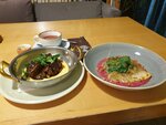Вдали от щума городского можно насладиться прекрасной прогулкой по хвойному лесу, покушать на уютной террасе с прекрасным обслуживанием . Из плюсов -есть блюда на мангале, из минусов ценник завышен, порции небольшие.В двух блюдах, что мы заказали были яйца всмятку(справа на фото борщ)