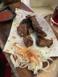 Дәмді тағамдар,қуырлақ пен кебаб, сондай-ақ салаттардың әртүрлі түрлері.