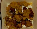 Хотела жареной курицы, а получила много жареной крошки с соусом терияки! Замечательная новинка за 189 рублей с пятью кусочками сухого куриного мяса (в лучшем случае)! Сравните сами, как говорится, ожидание и реальность))) Размер коробочки примерно 10*10 см, каждый кусок размер с 1-2 х рублевую монету, из них больше половины только тесто. Лучше бы гриль в соседнем супермаркете взяла(.