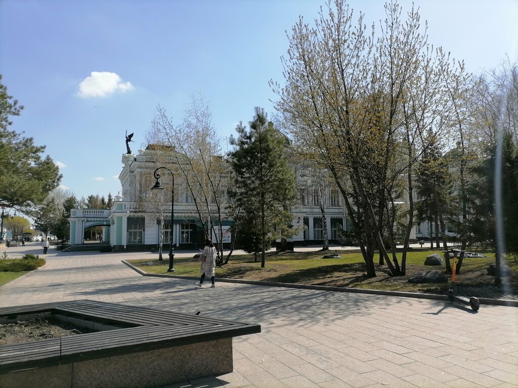 Хороший, небольшой, ухоженный сквер рядом со знаменитым в городе театром. По среди сквера расположена скульптура Достоевскому Ф.М. Много зелени, в жару хорошая тень от деревьев.