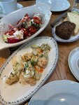 Лепешка с говяжьей щекой и огурцами пиккули 990₽ Мимо лепешек с надстройками пройти не могла, т.к. внешне они напоминают шаньги от шефа ресторана Kitchen Сергея Мирошникова, только набор продуктов с другим характером. Лепешка легкая, мелкопористая, мягкая, воздушная, беленькая, из качественной пшеничной муки, с добавлением греческого йогурта и сыра Фета. Готовят в дровяной печи. Чуть-чуть соли и цены бы лепешке не было. Мясо, думаю, су вид, соус демиглас, вкус насыщенный, мужской, перца от души до перебора, на фоне пресной лепешки и нежного скрэмбла этот перец просто бьет наотмашь. Мягкие огурцы и лук мариновали с куркумой, отсюда цвет и характерный вкус с горчинкой. Огурцу не хватает хрусткости. Подали тотчас, лепешка от соуса не размякла, это хорошо. Лепешку рекомендую, в следующий раз, если такой случится, попробую с креветками, уверена, она мне понравится. Креветки с авокадо и фенхелем (150г/790₽) Обжаренные креветки, авокадо произвольной нарезки, маринованный фенхель, заправка на основе тахини, масло паприки. Тахини - это тот же урбеч из кунжута. Вкус тахини ореховый, горьковато-терпкий, с переходом в сладкий. Что касается салата, то фенхеля кот наплакал, нарезка авокадо небрежная, сибулет выглядит неважно. О присутствии соуса шрирача официантка ресторана, замыкающего пятерку лучших, не в курсе, поэтому объяснить кисло-сладкий вкус заправки не смогла, наоборот, отрицала сам факт (пассивно). Салат рекомендую, но повар готовил его без души (уверена, времени не было, все девицы в ресторане как сговорились и ели салаты). Салат из свежих овощей с сыром фета (300г/790₽) Помидоры, огурцы, перец болгарский, оливки каламата, красный лук, сыр фета. Заправка зеленое карпаччо, базилик, крем бальзамик. Вопросов нет: овощи свежие, заправка кисло-сладкая, сыра фета много, вкус цельный, свежий, знакомый и даже любимый, вкусно. Рекомендую. Картофель конфи с красной икрой (260г/620₽) Картофель приготовлен идеально: тонкая корочка снаружи, мягкая текстура внутри, вкус нежный, сливочного масла не пожалели. Компаньоном к картофелю идет соус дзадзики (сметана, зелень, огурец), икра была лишней (для меня). Вкусно, рекомендую. Сибас с соусом из каперсов (310г/1450₽) Рыбу запекли в угольном гриле до хрустящей корочки, дополнили пикантным соусом на основе куриного бульона с добавлением микса зелени, каперсов и сливочного масла. Просто, вкусно, полезно, гармония. Рекомендую. Наполеон со свежими ягодами (150г/590₽) Десерт похож на Наполеон из нашего екатеринбуржского ресторана Паштет, крем заварной, его достаточно, тесто не пересушено, цвет красивый, вкусно, рекомендую. Хлеб и масло - комплимент, приятно. Резюмирую. Если бы ресторан находился в Екатеринбурге, я бы, наверное, ходила в него иногда. В будни. Завтракать или обедать, с подружками поболтать… А что касается пятого места, то это навряд ли. Ресторан хороший, цены подъемные, меню обширное, ровное, выдержано в едином гастрономическом стиле, много блюд из теста, кормят вкусно, но недоработки есть, обслуживание дружелюбное, но презентация блюд слабенькая, да и грязные тарелки уносят через раз… Придется ехать ещё, не люблю, когда нет четкого мнения, но впечатление ресторан произвел хорошее. Заведение рекомендую!