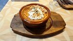 Солянка на мясном бульоне с ветчиной, сосисками, салями и копченой говядиной, картофелем, луком, маринованными огурцами, маслинами, лимоном, подается со сметаной