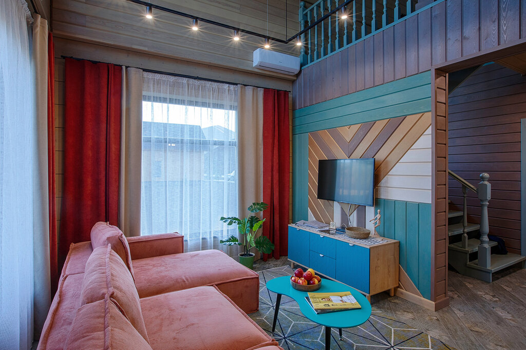 40 М² 1 комната 2 человека Номер располагается на втором этаже мини-гостиницы. Имеет панорамное окно с видом на поле и реку. Оснащен 1 двуспальной кроватью и 1 двуспальным раздвижным диваном. 1 дополнительное место 10000 тенге.
