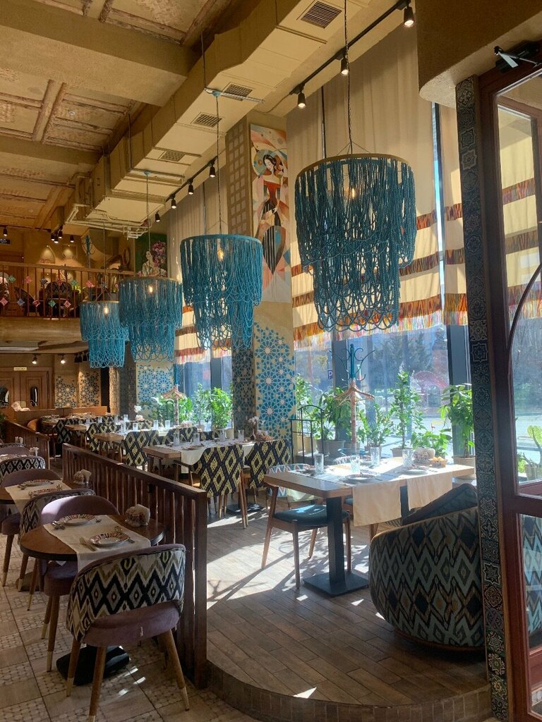 Из плюсов могу назвать геолокацию- ресторан с детским развлекательным центром в самом эпицентре города . Ресторан под троен под колорит Узбекистана. С коротким интервалом официанты развлекают посетителей народными танцами. По центру есть стойка из разных сладостей (шоколадный фонтан, мороженое, булочки , десерты) из минусов - пришли мы на 2-ой день после открытия: очень много народу (ждали столик - 25 минут ) , не работал туалет. Для любителей алкоголя хочу предупредить что это халяльное заведение. Цена за детскую площадку - безлимит 6 тыс. Тенге конечно дороговато ( 2 детей- 12 тыс тенге). По кухне нареканий нет. В целом твердые 3 звезды