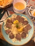 Очень красиво, обслуживание быстрое, официант и администратор вежливые - сразу располагают к себе. Меню большое, много местной кухни, подача быстрая. Пробовали чебуреки и бишбармак. Чебуреки мне показались слишком жирноваты, не внутри сок, а снаружи, тесто. Бишбармак брали обычный вкусно) первый раз пробовала бульон наваристый, мясо достаточно. Чай очень понравился. Цены приемлемые.