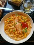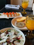 Отличное место. Встретили хорошо. Стол подготовлен красиво. Меню большое. Вид...вроде окно есть, и стол у окна, но одинтгость - спиной к окну, а второй гость - далеко от окна и кроме самого низа храма ничего не видно. В туалете все что надо есть, в том числе крем, присутвует, правда, лишний запах. А теперь к блюдам) Пока ждали блюда принесли хлеб с маслом. Комплимент от заведения. Тальятелле с лососем и красной икрой понравилось. Икры не пожалели, рыбы хотелось бы больше. Вынесли блюдо вместе блюдом для второго гостя, и соус дал корочку. Но небольшой слегка подкопченный лосось доставил удовольствие. Чай с десертом доставил удовольствие. На огромной тарелке не потерялся кусочек медовика. Медовик нежный-пренежный с мороженным, зафиксированным на карамели. Соотношение цена-качество отличное