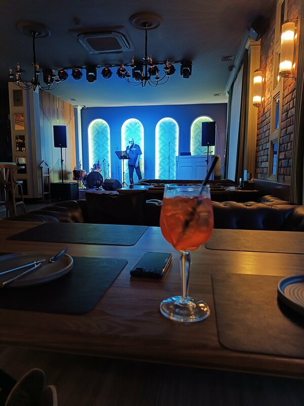 Приятная атмосфера!хорошее обслуживание,по четвергам поёт Зарецкий!интерьер понравился,лаконично,но со вкусом!а главное чисто и уютно!кухня средняя,разнообразие напитков в баре на хорошем уровне!
