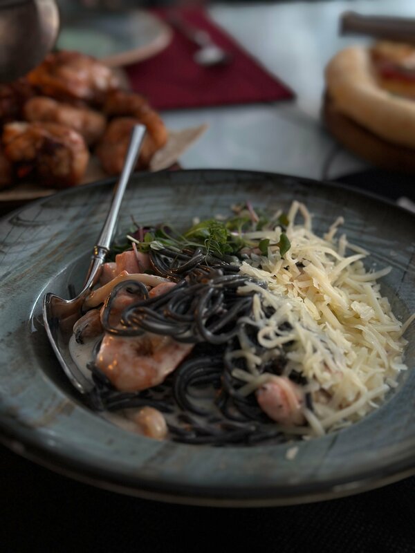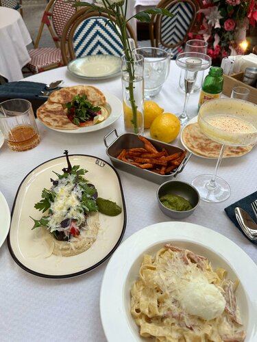 Уютная летняя терраса с системой охлаждения. Персональный достаточно внимательный. Нам понравился куриный шашлык, как я поняла, это одно из топ блюд у заведения. Хорошая паста с морепродуктами👌🏻
