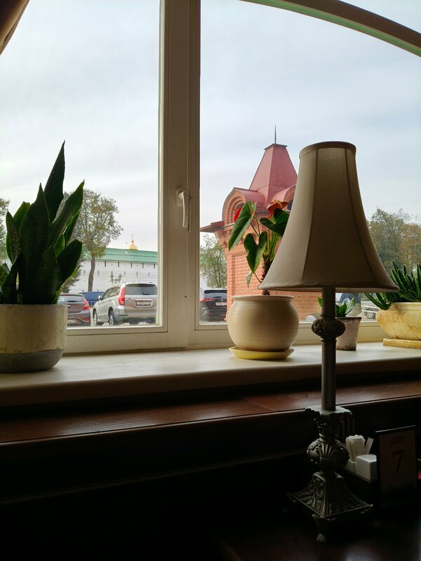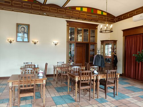 Ресторан находится рядом со стенами храма. Храм видно из окон. В меню есть пельмени и вареники, которые готовятся также в храме. Большие светлые и просторные залы, красивый интерьер: есть столики с диванами на 4 человека рядом с окном, есть столики на 2 человека. Я была в дневное время в пятницу и народу было немного. Тихая спокойная музыка. Меню обширное: 9 видов супов, горячие рыбные и мясные блюда, паста 3 видов, пицца 5 видов. Официанты приветливые, рассказывают об особенностях блюд и могут порекомендовать вам что -то. Я взяла щучьи котлеты: к котлетам прилагается пюре и грибной сливочный соус ( на октябрь 2025 стоимость 550₽). Время готовки составило около 20 минут. Котлеты очень вкусные, такое ощущение что они паровые. Есть отдельная линейка десертов от простого печенья (в мой приход его не было) до чизкейка и панакотты. Кушать на диване не очень удобно, так как стол высокий. Туалетные кабины: 2 мужские, 2 женские. И ещё много птиц, которые весело поют