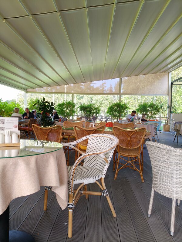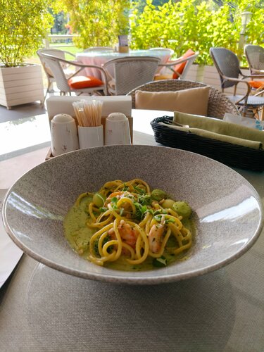Ресторанчик на территории ВДНХ, находится не в самом оживлённом месте, но в воскресенье (сентябрь 2025) много столиков занято, в том числе семьями с детьми. Есть большая летняя веранда, на которой лёгкий ветерок обдувает, а деревья вокруг и зелёная изгородь из кустов, защищают от солнца. Работают быстро и слаженно. Я выбрала пасту с креветками, скорость приготовления около 15 минут, возможно и меньше. Паста мне понравилась, но из приборов дали только вилку и нож. Фишкой заведения является возможность приготовить мини - пиццу деткам (мастер класс бесплатный в выходные с 13 до 17 час). Дети рядом со мной испекли свои пиццы. Также в ресторане имеется система лояльности, можно зарегистрироваться и получить бонусные баллы и не только.