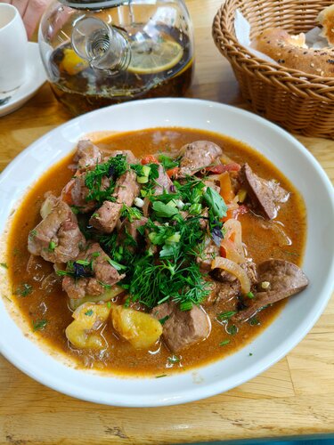 Помещение с претензией на изысканность. Но на входе оторвана ручка и привязана тряпкой. Умывальник, в котором кран держится на честном слове. Руки вытереть нечем. По обслуживанию: вам предлагают присесть за столик и приносят меню (на минутку, это столовая ). Мы заказали печень, заявленное время приготовления 15 минут, чай и нам предложили булку. Чай принесли быстро (вкусный), лепёшку тоже (холодная, при презентации было сказано,что из тандыра. По форме да, но холодная и не факт, что свежая ). Печень мы ждали целую вечность (точно больше 20 минут). По блюду: претензий нет. Большая порция, свежеприготовленное, вкусное. Потом мы попросили счёт. И неприятное открытие: 10% за обслуживание. Ребята, у вас столовая. Почему вы не предупредили? Дальше интереснее: я попросила оплатить счёт. Девушка пришла и попросила наличные или перевод. Я отказалась, тогда меня пригласили к терминалу. По связке цена - качество, все отлично. На двоих 1045₽ с учётом сбора за обслуживание