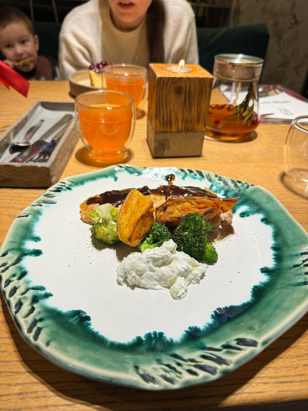 Пока были в Ярославле в данный ресторан заезжали дважды: на завтрак и на ужин. Оба раза были очень довольны. Меню завтрака очень разнообразное. Я брал свой любимый вариант норвежского завтрака, всё было очень вкусно. Дополнил его потом ещё блинчиками со сгущёнкой и вареньем и кофе. Тоже очень вкусно! Сыну брали рисовую кашу, она была очень нежная. Вечером после длинного дня эффект получился даже ещё лучше. Брускетта с красной рыбой и тыквенный суп это чистое наслаждение. Куриная грудка с бататом и соусом дзадзики очень интересное блюдо, но скорее на любителя. Супруга брала ещё холодный чай с сырной пеной. Я к этому напитку отнёсся сомнительно, но зря! Это оказалось очень крутое сочетание вкуса, крайне рекомендую! Горячий чай тоже был весьма неплох. Внутри ресторан хорошо оформлен. Однозначно плюс за гардероб, чтобы не нести вещи в зал, и за чистую и очень интересно оформленную уборную. Такие вещи определённо оставляют приятные впечатления. Девушки официантки очень приветливые и внимательные. Ещё бы я отметил два момента. Во-первых, это детская комната. Есть возможность ребёнка спокойно отправить туда поиграть и спокойно покушать самому. Во-вторых, расположение в бизнес-центре с подземной парковкой, что в эти зимние прохладные дни было весьма актуально. А на парковке ещё и автомобильная мойка есть: машину оставил мыться, а сам пошёл на завтрак перед дальнейшим путешествием. Однозначно рекомендую к посещению!