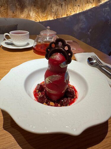 Ресторан Бирукка был первым местом в Ярославле, которое нас встретило после длинного пути из Петербурга. И встреча была тёплой и приятной. Ресторан очень уютный и приятно оформленный. Сразу при входе гардероб, чтобы оставить вещи. Очень интересно оформленная уборная с раковиной водопадом, оригинально! Персонал внимательный, всегда готов что-то посоветовать. Для себя отметил, как официанты тихо и спокойно разговаривают, прекрасно дополняя обстановку зала. Стоит иметь в виду, что меню не очень большое. Есть интересные закуски, например, эклеры, украшенные икрой. Из основных блюд мне, честно говоря, выбрать было сложно, всё достаточно оригинальное (наверное, не на мой вкус). В итоге взял осьминога с гарниром, было вкусно. В оба наших посещения был органичен выбор десертов, но они были вкусными. А матрёшка с брусникой ещё и очень оригинальная! Мне всегда нравится, когда в ресторанах есть что-то такое не только вкусное, но и интересное по внешнему виду. А тут ещё и с нашим национальным колоритом. Приятно! Отдельно напишу про чудесный напиток душепарка. После прогулки на морозе заходит на ура. Однозначно потом, что, в отличие от одного другого места, был безалкогольный вариант. Рекомендую!