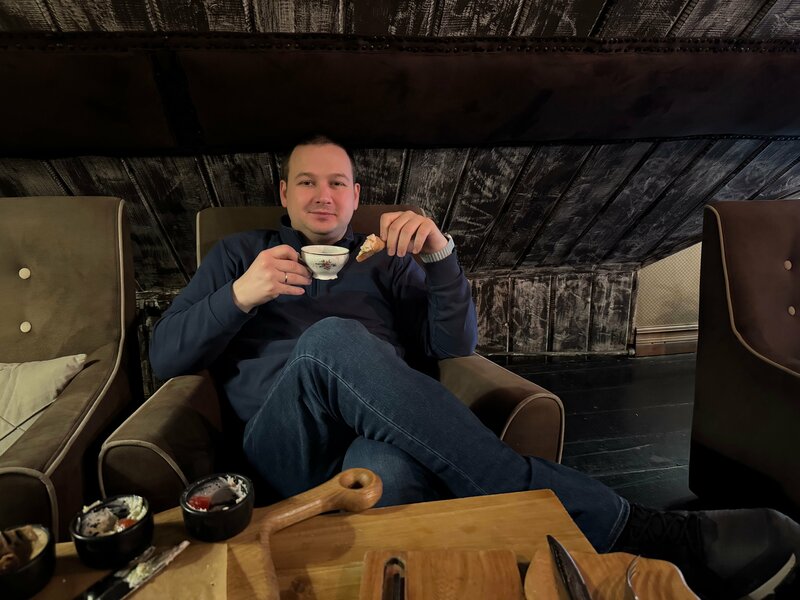В свой первый полноценный день в Ярославле мы решили зайти сюда на завтрак и не прогадали (если не считать того, что на время завтрака мы не успели)). Кафе очень аутентичное, прикольно оформлено. Мы сидели на втором этаже за кофейным столиком. Поймал себя на мысли, что было бы очень классно туда зайти без ребёнка, чтобы спокойно развалиться в кресле, кушая и попивая кофе. Отдельно хочу отметить посуду - она очень красивая и дополняет обстановку, в которой ты сидишь! По еде мы от всего остались в восторге. Пельмени ярушки были очень вкусными и необычными. Ассорти паштетов из ветчины, сыра и печени на меня произвели впечатление, при том, что я паштеты вообще особенно не люблю. Даже ребёнок их с удовольствием поел. А сырники были очень мягкими и нежными. Отдельно плюс кафе за оригинальность в оформлении уборной (дверь со стеклом и занавеской) и террасы на входе с героями Один дома! Однозначно рекомендую посетить данное кафе!