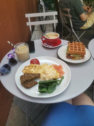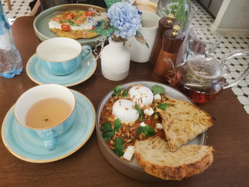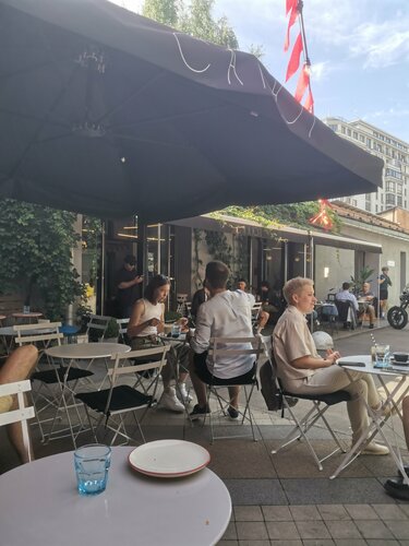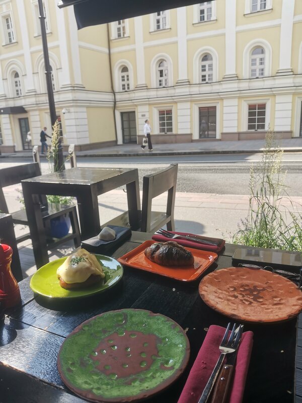 Атмосферное кафе в самом сердце столицы. Удобно расположено на тихой улице, рядом транспортная дорога, но это не мешает наслаждаться едой на летней веранде. Пробовали меню летнего завтрака на свежем воздухе - очень вкусно. Необычное сочетание пряного сыра и лёгкой сладости лавандового мёда с тёплым свежим круассаном и хрустящий хэшбраун под ломтиками лосося. Персонал приветливый и отзывчивый, интерьер стильный и запоминающийся. Санузел располагает необходимыми гигиеническими принадлежностями, которые могут пригодиться гостям заведения. 5 из 5🔥