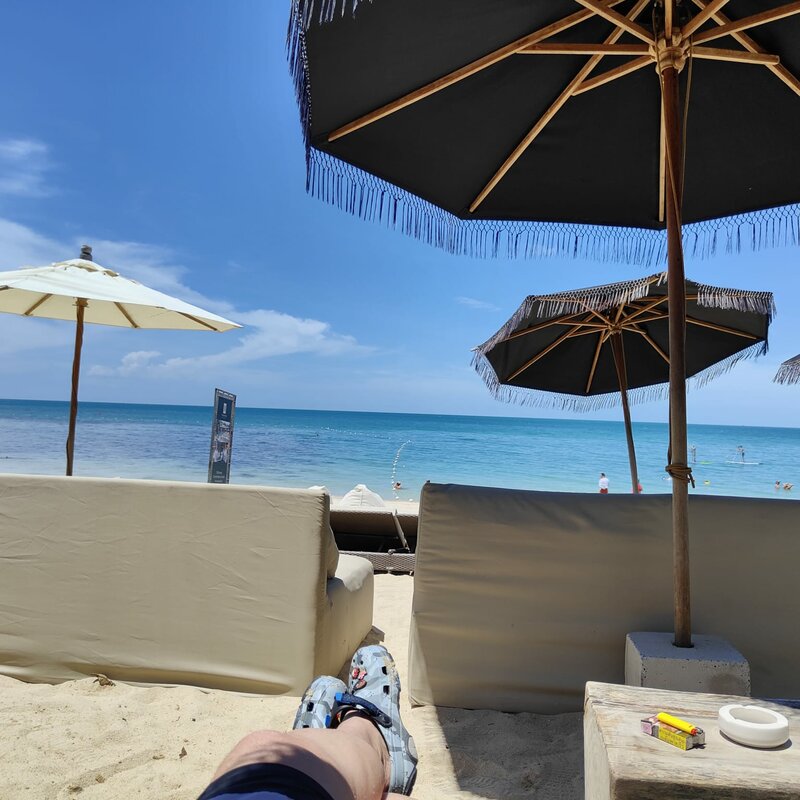 Пологий пляж, срезанный коралл, оч слабый прибой, отсутствие рыб, присутствие мусора, вокруг катера и лодки, которые мешают спокойному отдыху, вонь от дизелей лодочных моторов. Не рекомендую!!!