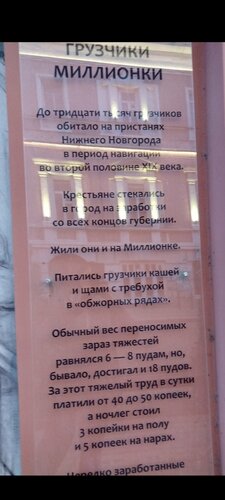 Экскурсия по улице - музею Миллионка. Ныне улица Кожевенная. Экскурсия от гида в форме городового. Сам экскурсовод, его рассказ и форма, дома исторической постройки - реально воссоздали жизнь Нижнего Новгорода на рубеже XIX-XX веков. Складские здания давали работу и пропитание бурлакам, грузчикам, рыбакам, торговкам. Информацию о жителях Миллионки и жизни " на дне" выдают дома, стены, барельефы, скульптуры и даже булыжник под ногами. Здесь же галерея героев из пьесы Максима Горького "На дне". Атмосферное место. Даже обычная прогулка по улице дает повод к размышлениям. Гость из Казани.