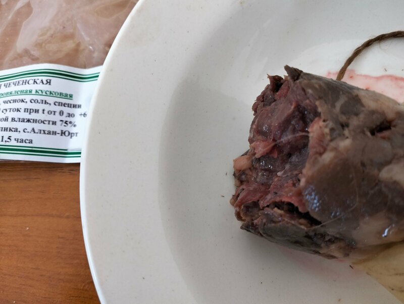 Покупаю баранину, индейку (огромные пласты филе, мясо не сухое), куриную голень (зернового откорма куры). Весовая продукция устраивает. Единственное, что - каре при такой цене все же не такое жирное должно быть. А то на дне лотка 3-4 штуки были с очень толстым слоем жира. А так мясо свежее, не заветренное. И в готовом виде очень хорошее. Держат уровень. Теперь по поводу полуфабрикатов. Снижаю балл за казы, в которой попался волос. Понятно, что проблема поставщика, это я отдельно отмечаю. Прилагаю фото с этикеткой. И периодически проблемы с оплатой картой.
