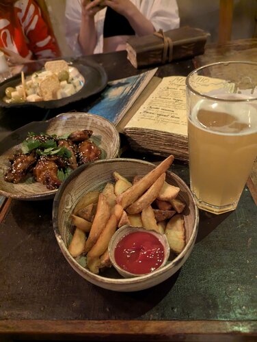 Шикарная атмосфера, потрясающее оформление и содержание меню, вкусные блюда с быстрой подачей, названия в меню интерпретированы под вселенную фентези и сказок, чудесное заведение, крайне рекомендую Ценник средний или чуть выше, зависит от того что заказывать По большей части заведение нацелено на алкоголь и вкусные блюда к нему, однако есть и достаточно безалкогольных напитков Персонал вежливый и внимательный, спасибо им большое за теплый прием Заведение определённо стоит посетить