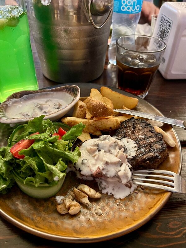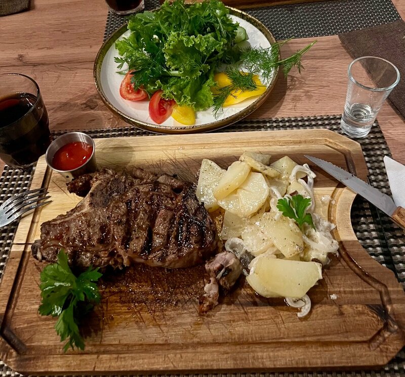 Отличные стейки! Соотношение цена/качество идеальное, многим заведениям стоит поучиться. Большие порции салатов, пробовали из баклажанов - очень вкусно. Посоветовал бы чуть больше света в основном зале.