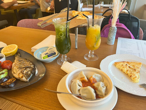 Вкусная грузинская кухня! Сочные, аппетитные хинкали с уткой в соусе сацебели, натуральный лимонад (пробовали тархун и манго-маракуйя)! Вкусная рыбка дорадо на гриле с овощами, подаётся с лимоном и гранатовым соусом. Всё понравилось! Уютно, вкусно, вежливый персонал.