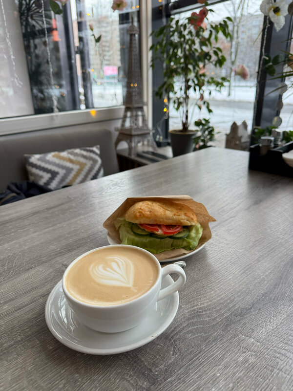 Зрительно - очень уютное место. Посетителей очень много. 💯 надо расширяться!) столики спареные, что не удобно, кушаешь с чужими людьми, ну, а чтобы добраться до своего места, нужно постоянно беспокоить сидящих. Капучино очень здесь нравится, а вот кофейные напитки типа Сникерс и Сыр/мед вообще не стоят своих денег - теплая безликая консистенция.