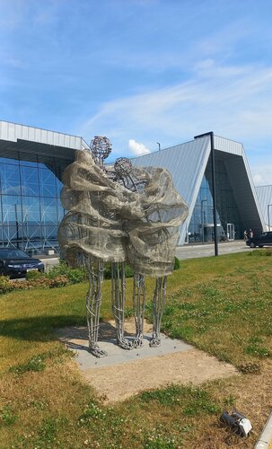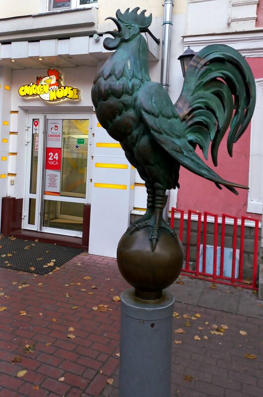 Гуляя по улице обратили внимание на толпу и очередь. Подошли поближе и обнаружили такую достопремечательсть в виде скульптуры Петуха. Кажется, что каждый турист хотел с ним сфотографироваться. Мы тоже постояли в очереди и сделали фото на память. Особенно понравился ракурс с Чикен хауз, эпично)))